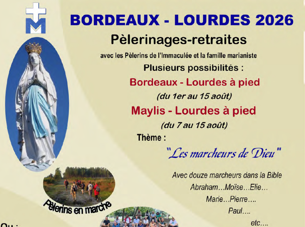 L’association les pèlerins de l’Immaculée organise un pèlerinage – retraite avec une marche de Bordeaux à Lourdes ou Maylis à Lourdes à des dates différentes.